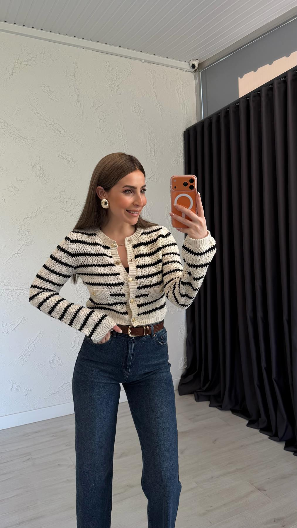 Çizgili Hmm Gold Düğmeli Triko Hırka Siyah (7608)
