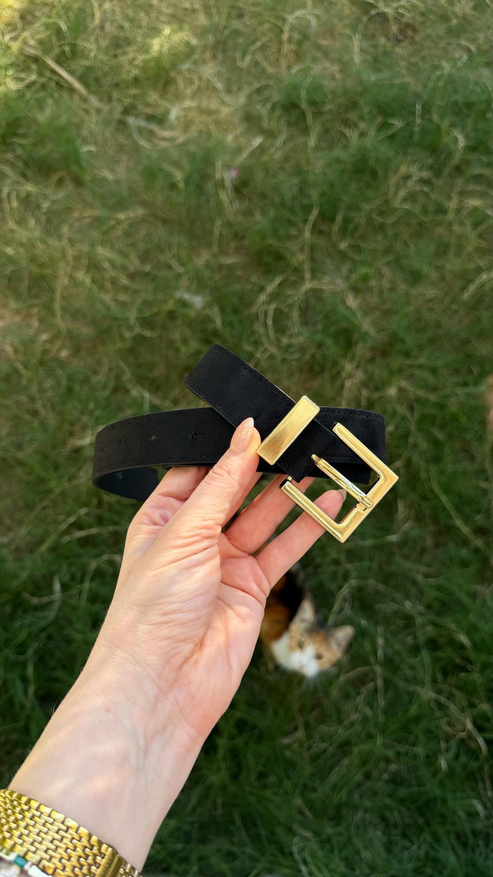 Süet Gold Tokalı Kemer Siyah