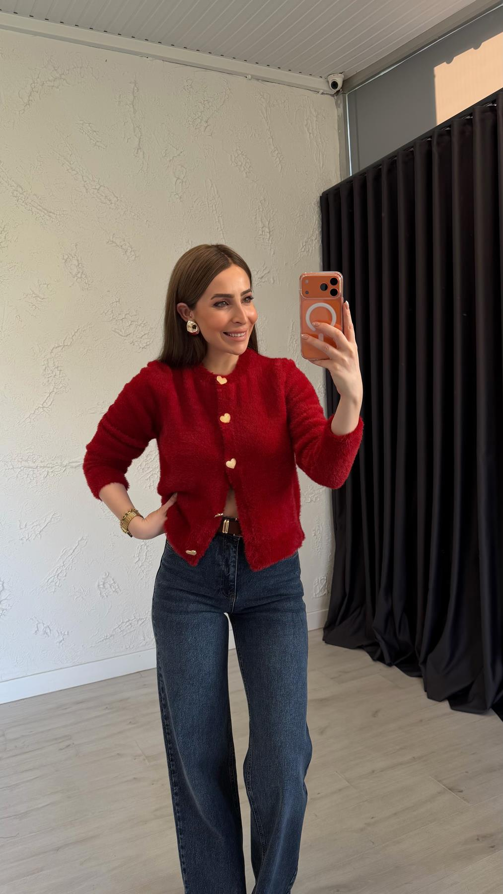 Yumoş Kalp Düğmeli Hırka Kırmızı (7729)